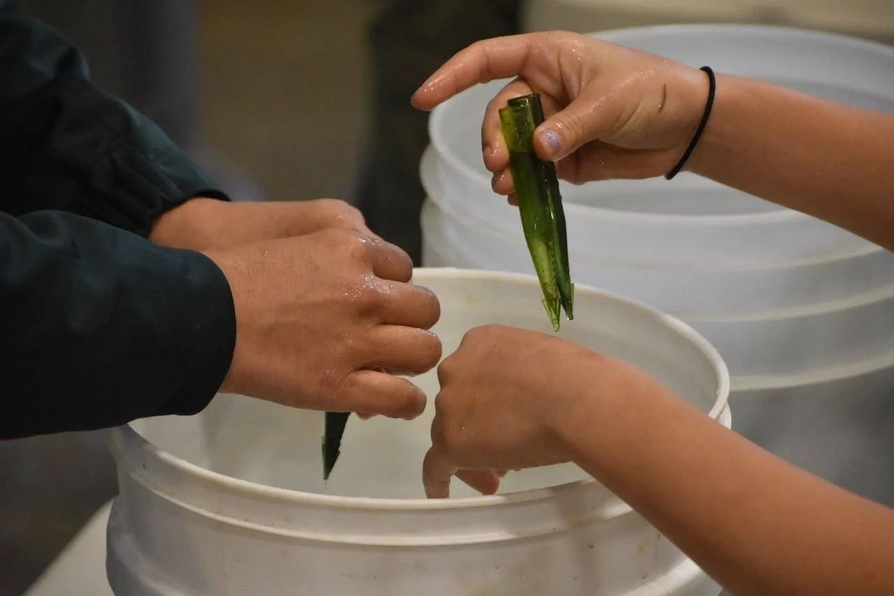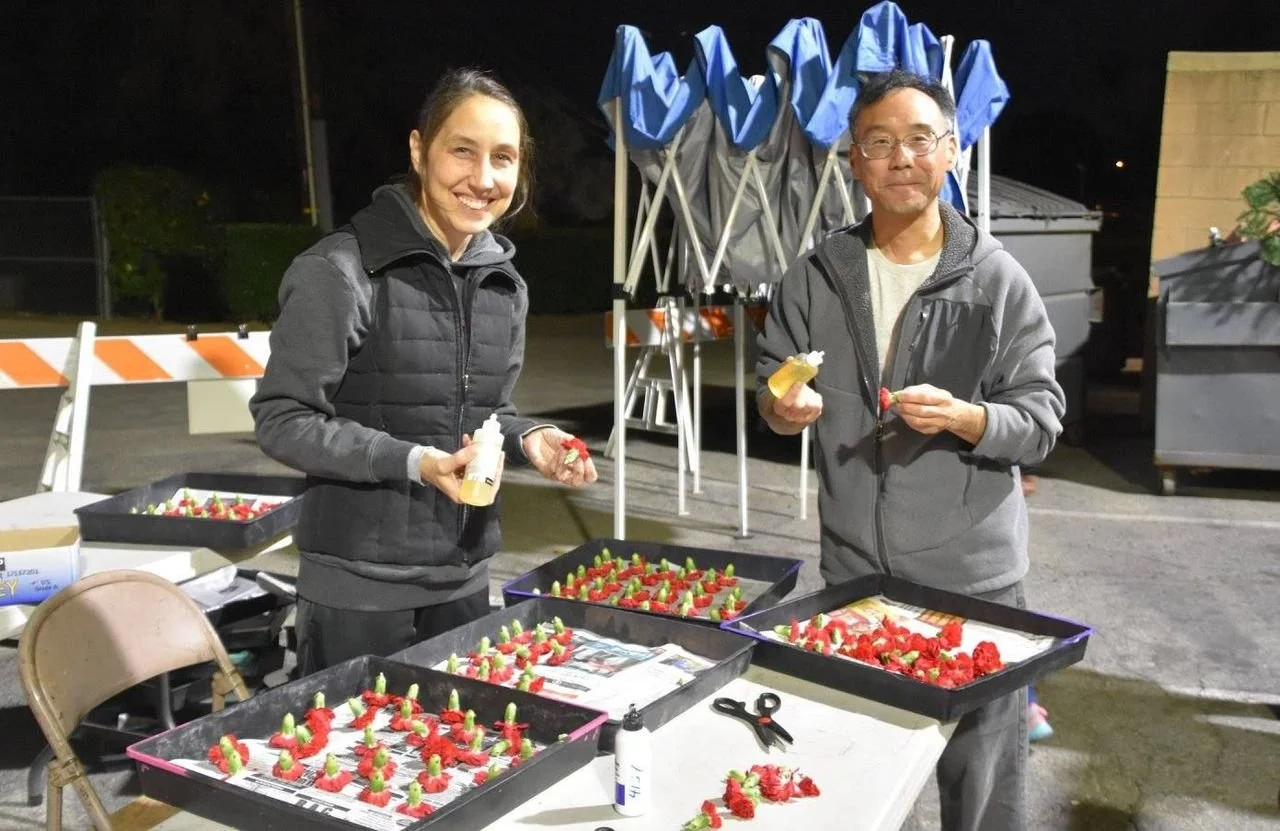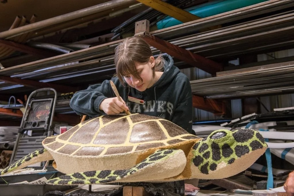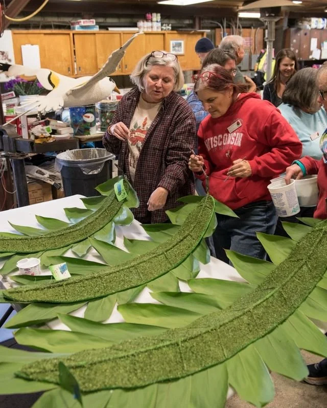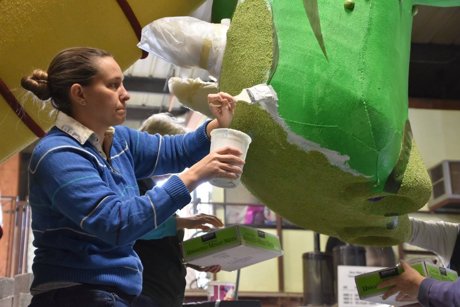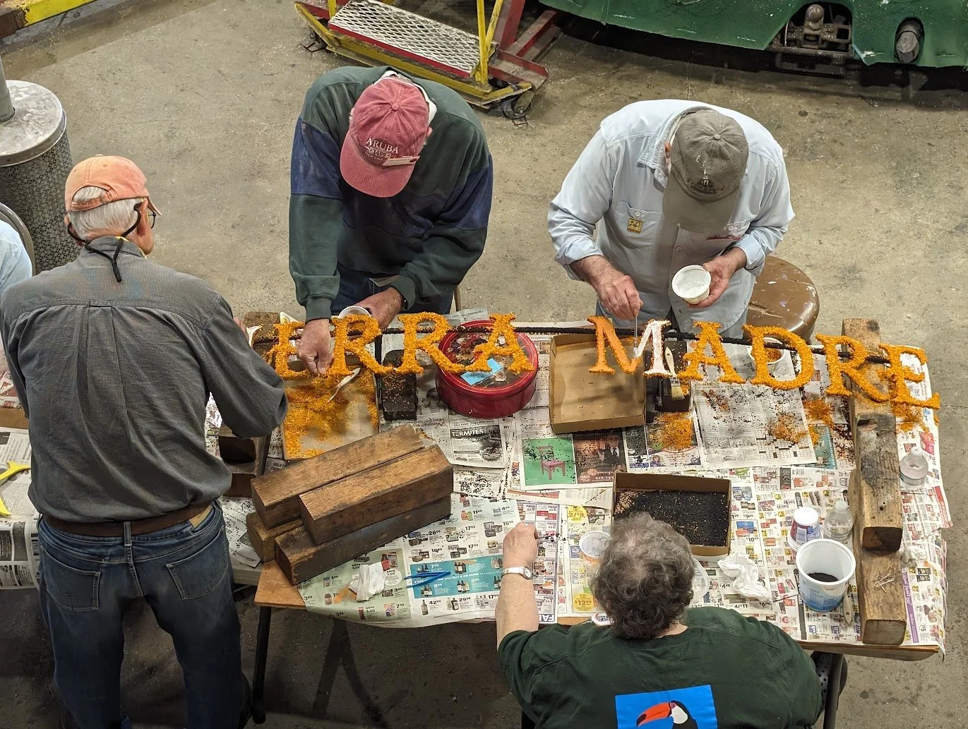 Once the float is built, that’s when we begin to “deco”. The process starts when seeds and dry products are painstakingly glued onto the float. The last few days before the parade are when the live flowers are attached.